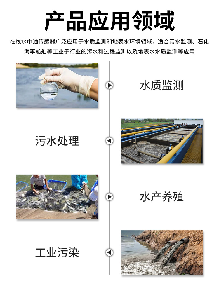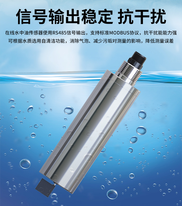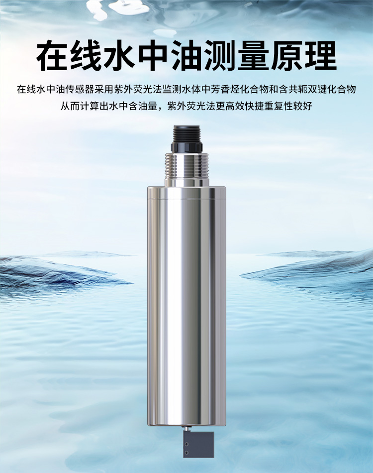 在線水中油傳感器,采用紫外熒光法原理監(jiān)測水體中芳香烴化合物和含共軛雙鍵化合物從而計(jì)算出水中含油量,熒光法更高效快捷重復(fù)性較好,并可在線實(shí)時(shí)監(jiān)測。根據(jù)水質(zhì)可選用自清潔功能,消除氣泡、減少污垢對測量的影響。