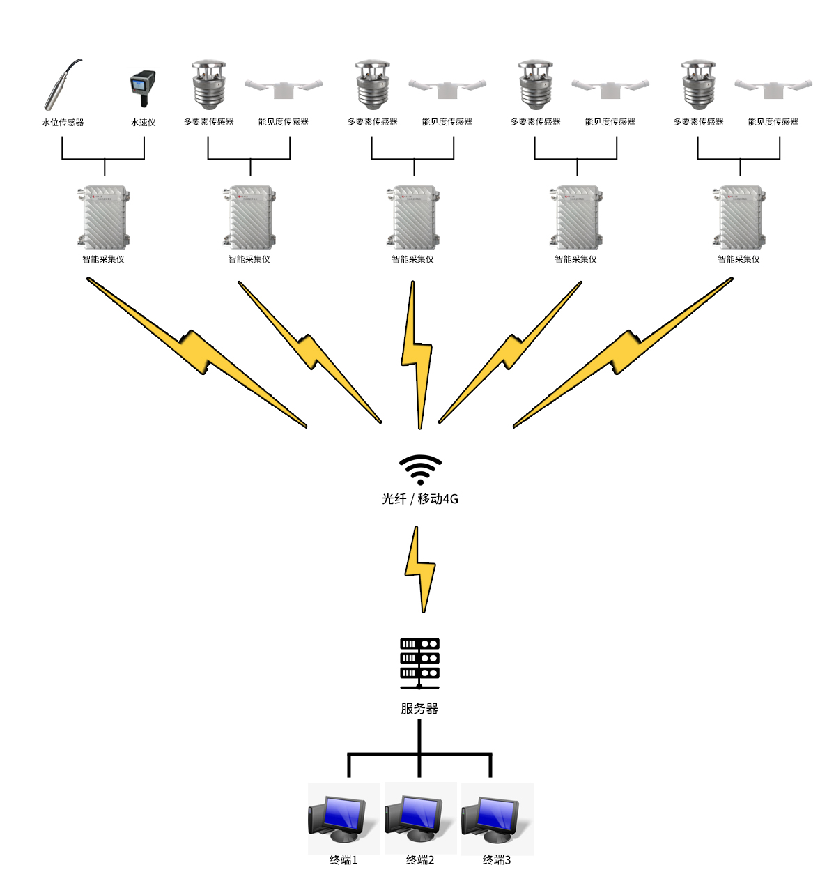 水文氣象預(yù)警在線監(jiān)測系統(tǒng)由多要素氣象傳感器、能見度傳感器、水位儀、水速儀、氣象數(shù)據(jù)采集儀、供電系統(tǒng)、戶外防護(hù)箱、安裝支架和避雷裝置等部分構(gòu)成。系統(tǒng)集了新型傳感技術(shù)、電磁兼容技術(shù)、數(shù)據(jù)處理與信號分析技術(shù)、低功耗設(shè)計技術(shù)、網(wǎng)絡(luò)通訊技術(shù)等,實現(xiàn)了對氣溫、濕度、氣壓、風(fēng)速、風(fēng)向、雨量、能見度、水位、水流速等信息的實時監(jiān)測,并將這些環(huán)境信息可通過4G/光纖等通訊傳輸方式傳輸?shù)?.分析系統(tǒng)(后臺)中,..分析系統(tǒng)可將收集到的信息進(jìn)行存儲、統(tǒng)計及分析,以報表、曲線、統(tǒng)計圖等方式顯示給用戶。