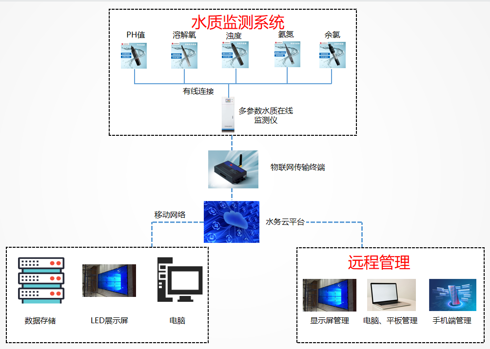 狀態監測:采集水質監測設備的運行狀態、工作電壓、電流等相關參數。