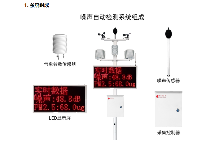 噪聲監測子站是環境噪聲自動監測系統的戶外采樣部分,包括全天候戶外 傳聲器、采集分析單元、通信單元、電源控制單元以及機箱等。環境噪聲自動監測系統是由噪聲監測子站、傳輸網絡、噪聲監控 平臺等組成的,能實現噪聲自動監測并實時進行噪聲數據統計分析的系統。噪 聲監測子站可擴展氣象監測模塊、車流量監測模塊、視頻監控模塊、LED 顯示 模塊、語音播報模塊等。